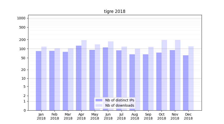 Number of downloads for software package tigre, year by year, from 2025 back to 2014 (years with no downloads are omitted):