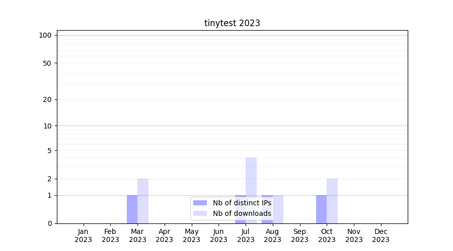 Number of downloads for software package tinytest, year by year, from 2025 back to 2014 (years with no downloads are omitted):