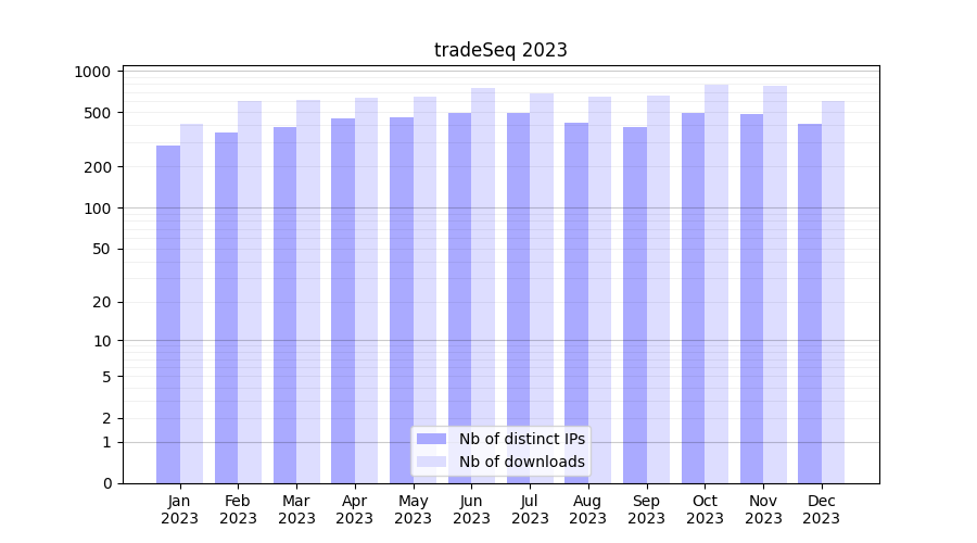 Number of downloads for software package tradeSeq, year by year, from 2025 back to 2014 (years with no downloads are omitted):