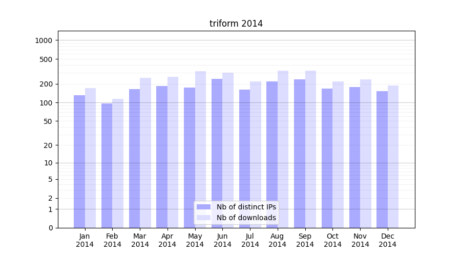 Number of downloads for software package triform, year by year, from 2025 back to 2014 (years with no downloads are omitted):