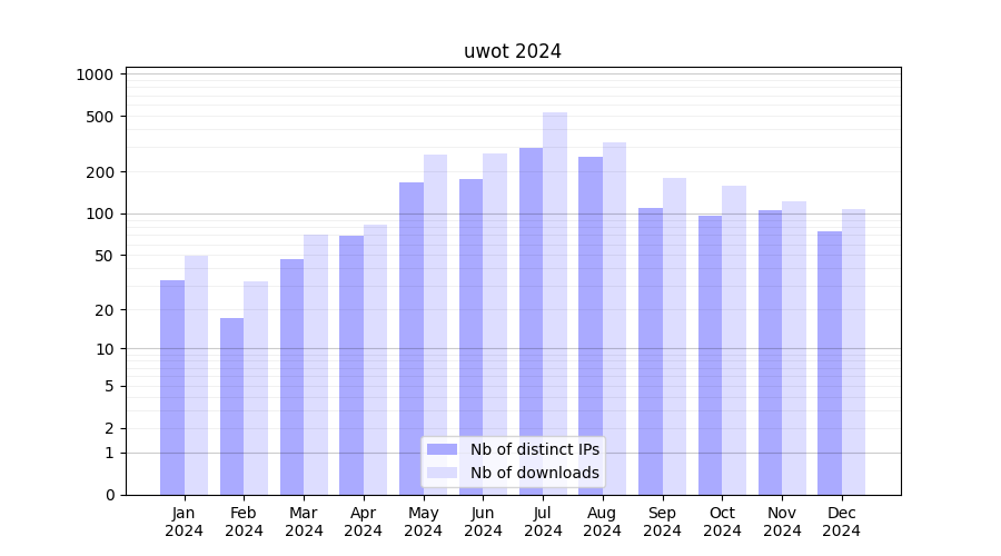 Number of downloads for software package uwot, year by year, from 2025 back to 2014 (years with no downloads are omitted):