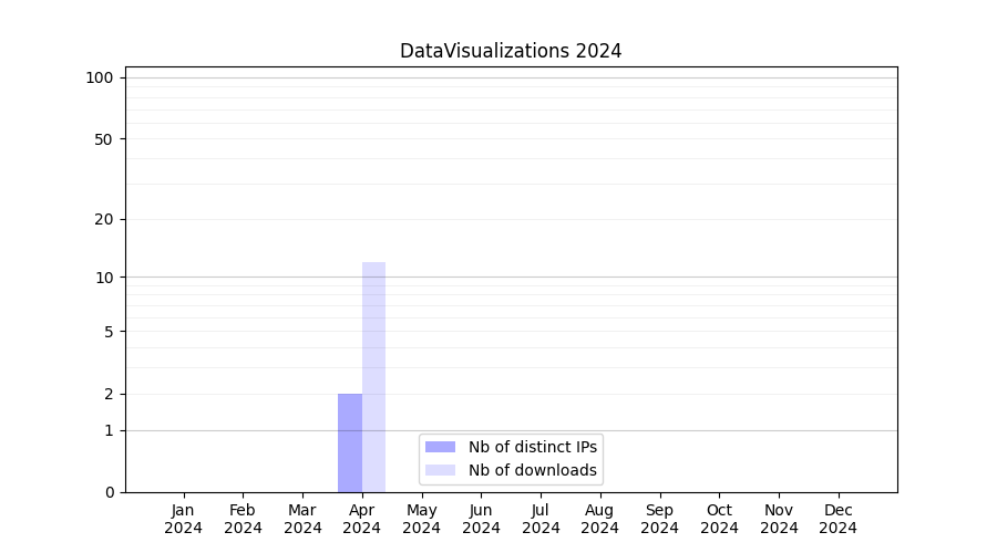 Number of downloads for annotation package DataVisualizations, year by year, from 2025 back to 2014 (years with no downloads are omitted):