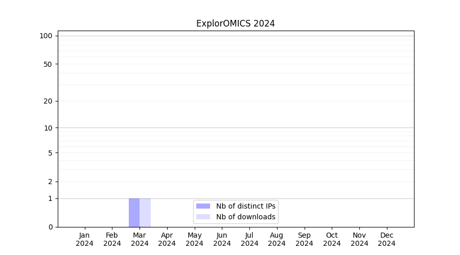 Number of downloads for annotation package ExplorOMICS, year by year, from 2025 back to 2014 (years with no downloads are omitted):