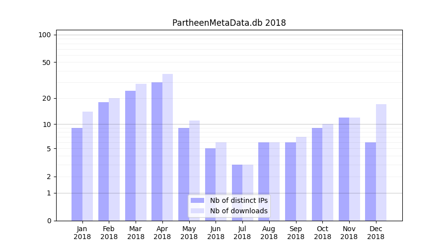 PartheenMetaData.db_2018_stats.tab| Month | Nb of distinct IPs | Nb of downloads |