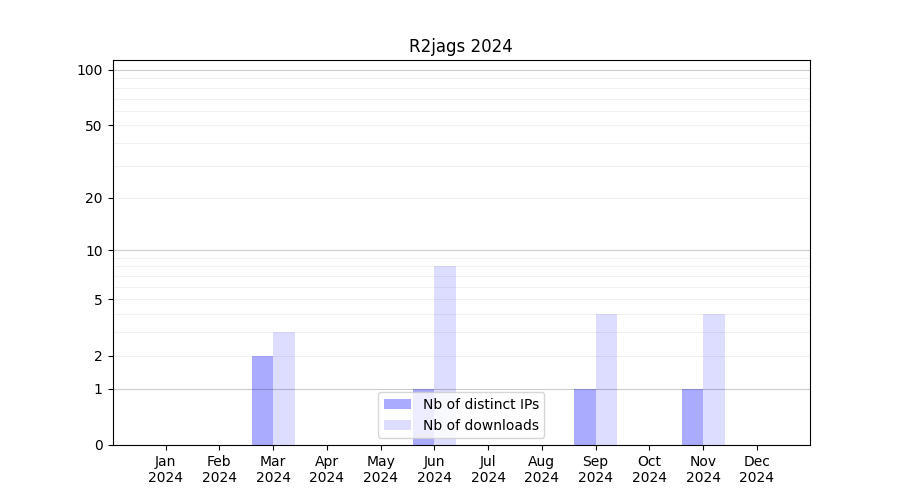 Number of downloads for annotation package R2jags, year by year, from 2025 back to 2014 (years with no downloads are omitted):