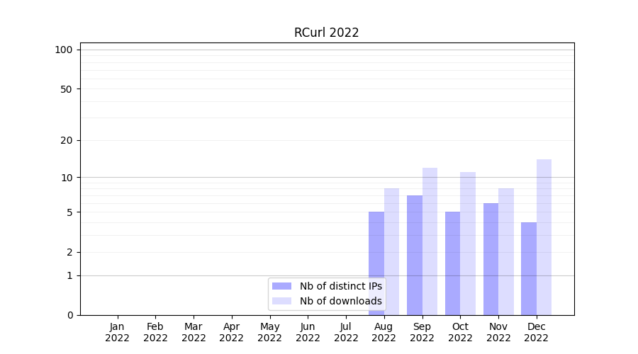Number of downloads for annotation package RCurl, year by year, from 2025 back to 2014 (years with no downloads are omitted):
