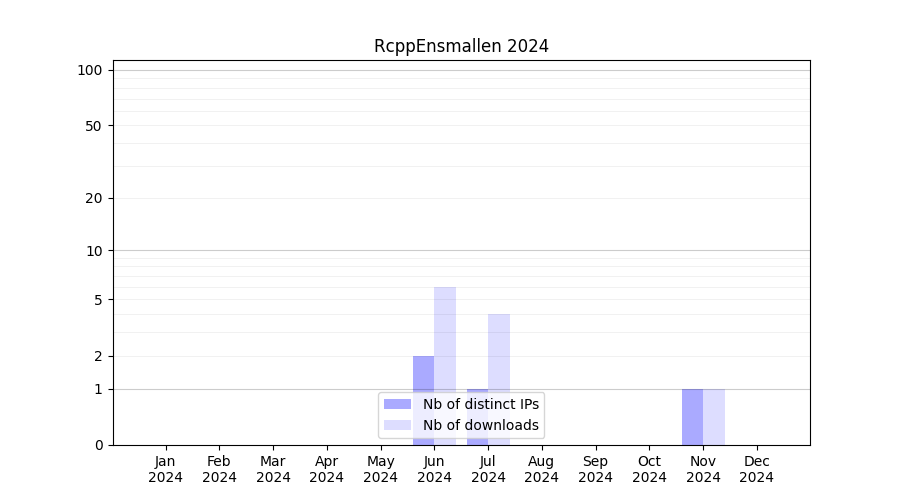 Number of downloads for annotation package RcppEnsmallen, year by year, from 2025 back to 2014 (years with no downloads are omitted):