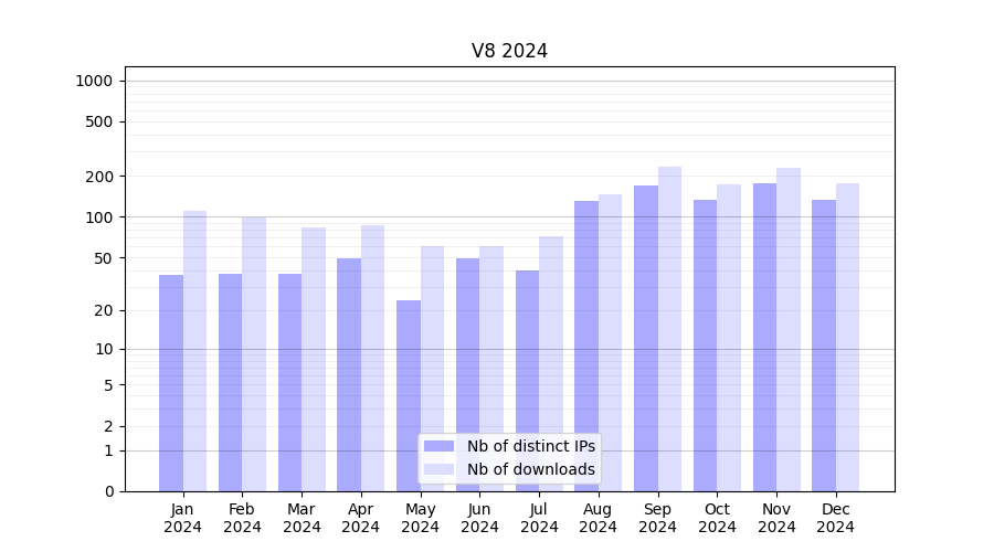Number of downloads for annotation package V8, year by year, from 2025 back to 2014 (years with no downloads are omitted):