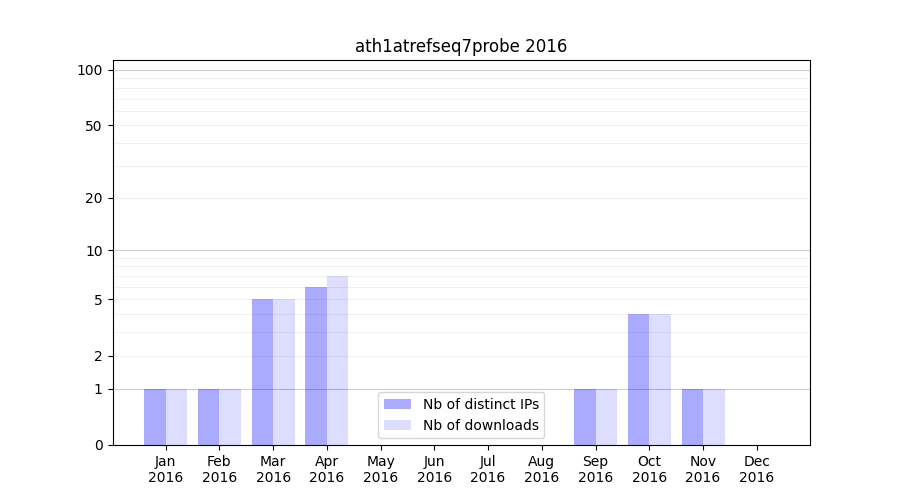 Number of downloads for annotation package ath1atrefseq7probe, year by year, from 2025 back to 2014 (years with no downloads are omitted):
