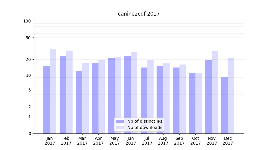 Number of downloads for annotation package canine2cdf, year by year, from 2025 back to 2014 (years with no downloads are omitted):