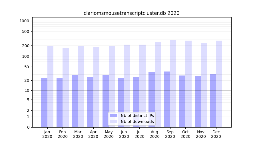 clariomsmousetranscriptcluster.db_2020_stats.tab| Month | Nb of distinct IPs | Nb of downloads |