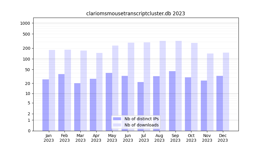 clariomsmousetranscriptcluster.db_2023_stats.tab| Month | Nb of distinct IPs | Nb of downloads |