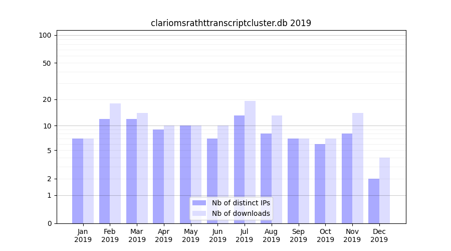 clariomsrathttranscriptcluster.db_2019_stats.tab| Month | Nb of distinct IPs | Nb of downloads |
