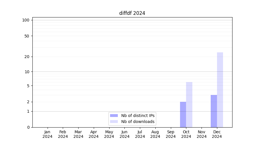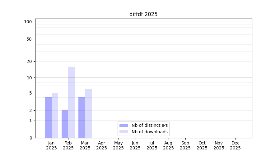 Number of downloads for annotation package diffdf, year by year, from 2025 back to 2014 (years with no downloads are omitted):