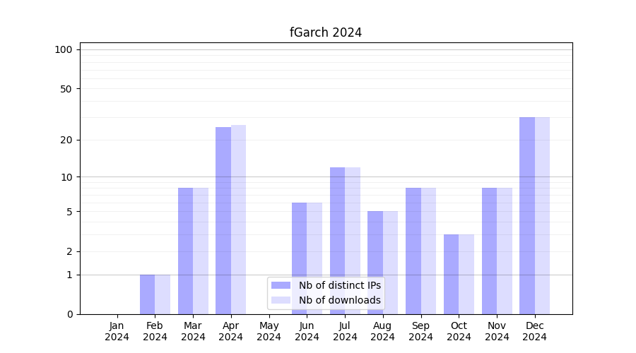 Number of downloads for annotation package fGarch, year by year, from 2025 back to 2014 (years with no downloads are omitted):