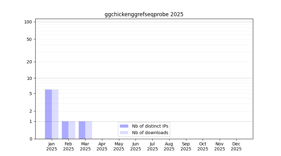 Number of downloads for annotation package ggchickenggrefseqprobe, year by year, from 2025 back to 2014 (years with no downloads are omitted):