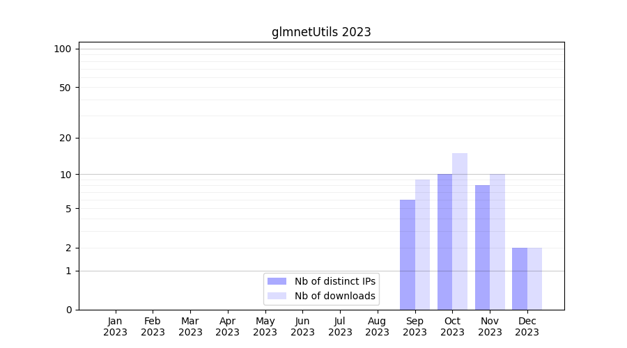 Number of downloads for annotation package glmnetUtils, year by year, from 2025 back to 2014 (years with no downloads are omitted):