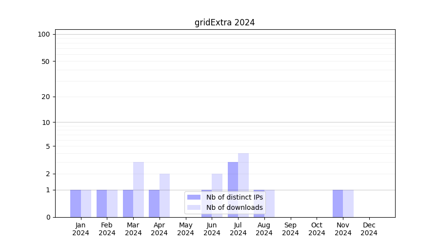 Number of downloads for annotation package gridExtra, year by year, from 2025 back to 2014 (years with no downloads are omitted):