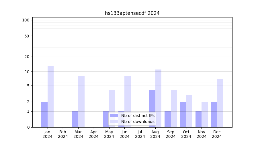 Number of downloads for annotation package hs133aptensecdf, year by year, from 2025 back to 2014 (years with no downloads are omitted):