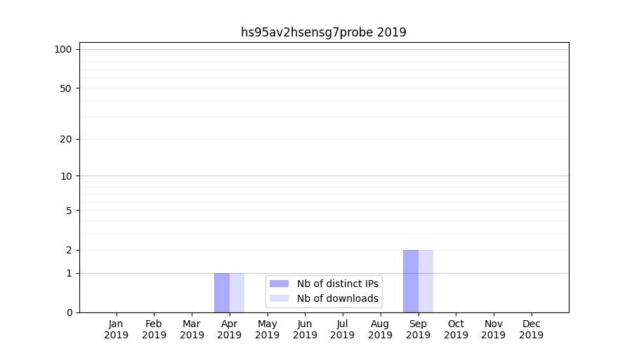 Number of downloads for annotation package hs95av2hsensg7probe, year by year, from 2025 back to 2014 (years with no downloads are omitted):