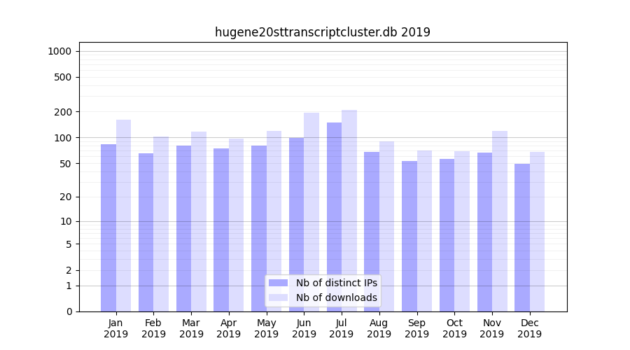 hugene20sttranscriptcluster.db_2019_stats.tab| Month | Nb of distinct IPs | Nb of downloads |