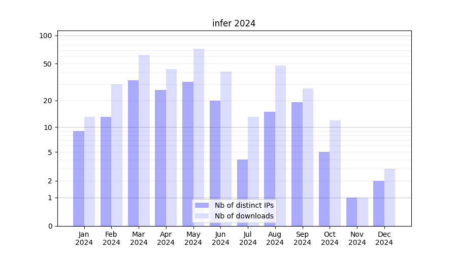 Number of downloads for annotation package infer, year by year, from 2025 back to 2014 (years with no downloads are omitted):