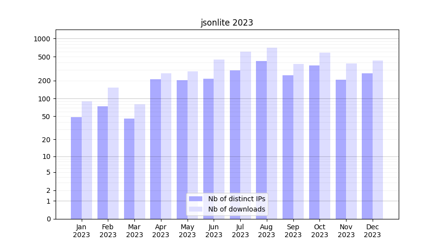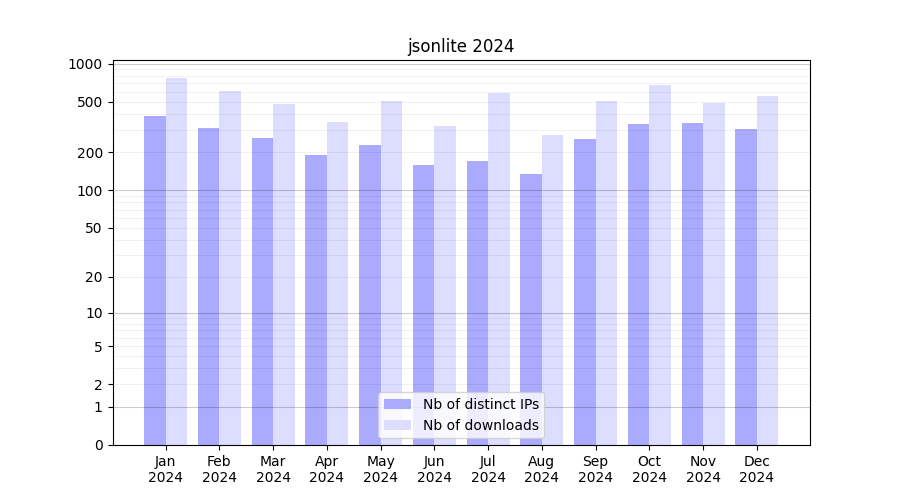Number of downloads for annotation package jsonlite, year by year, from 2025 back to 2014 (years with no downloads are omitted):