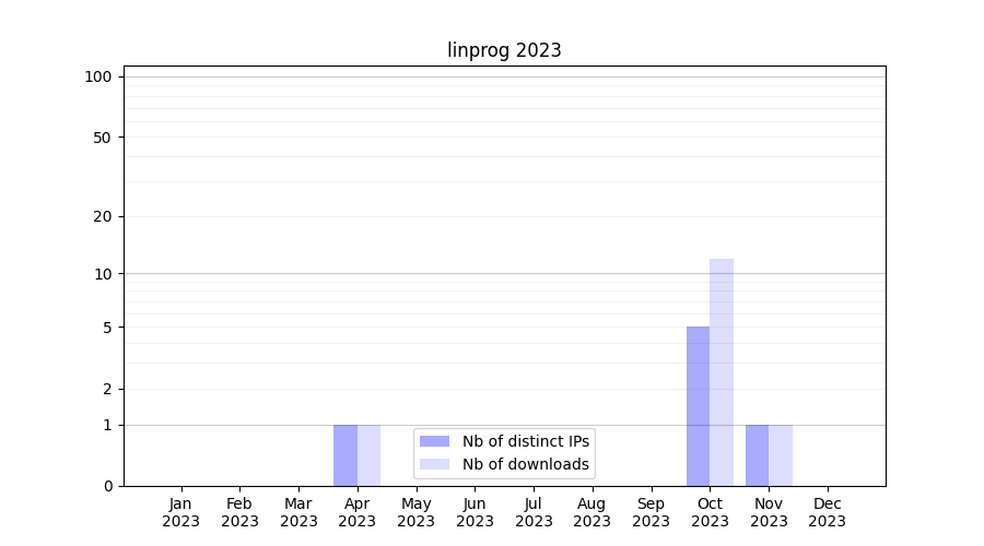 Number of downloads for annotation package linprog, year by year, from 2025 back to 2014 (years with no downloads are omitted):