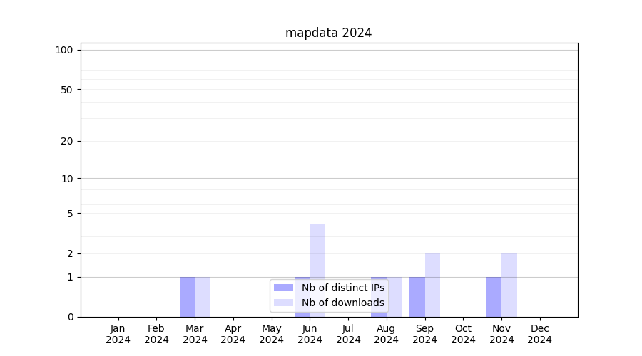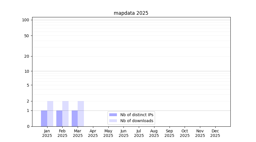 Number of downloads for annotation package mapdata, year by year, from 2025 back to 2014 (years with no downloads are omitted):