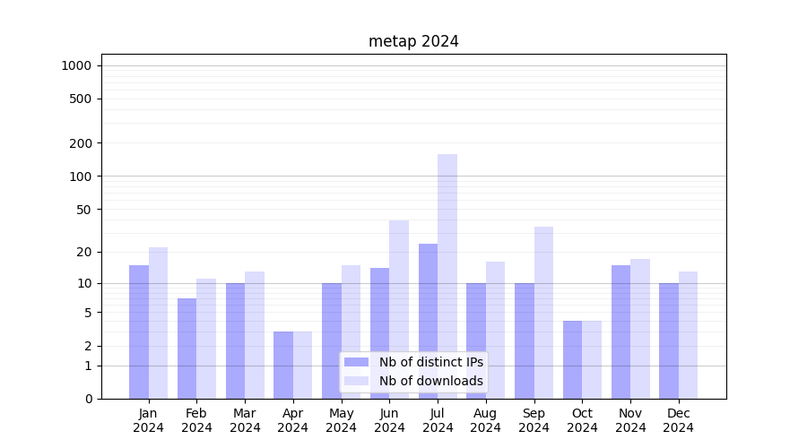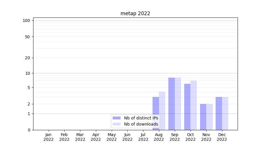 Number of downloads for annotation package metap, year by year, from 2025 back to 2014 (years with no downloads are omitted):