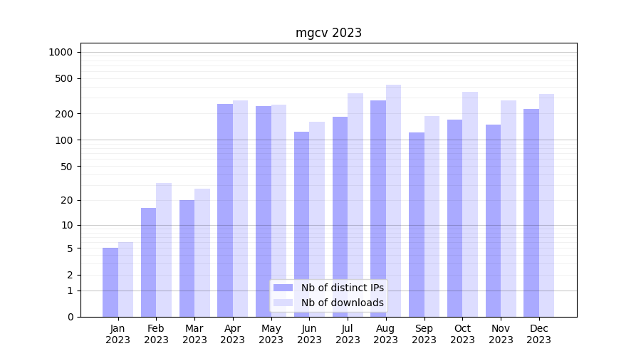Number of downloads for annotation package mgcv, year by year, from 2025 back to 2014 (years with no downloads are omitted):