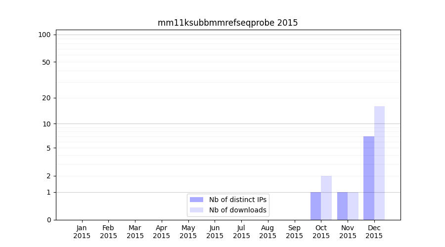 Number of downloads for annotation package mm11ksubbmmrefseqprobe, year by year, from 2025 back to 2014 (years with no downloads are omitted):