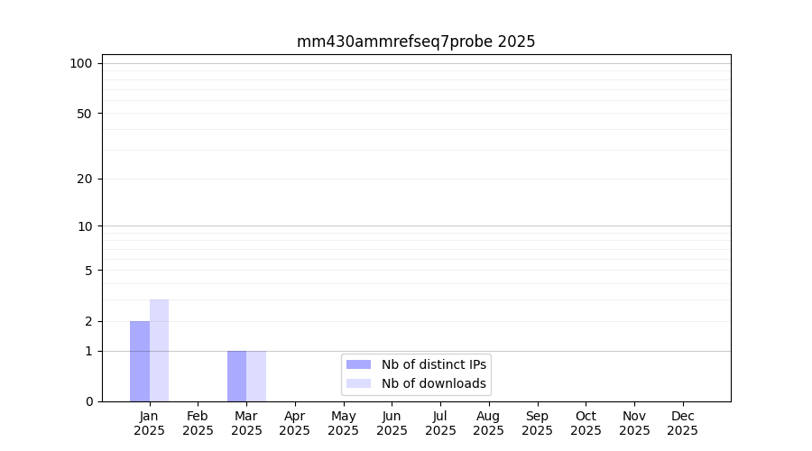 Number of downloads for annotation package mm430ammrefseq7probe, year by year, from 2025 back to 2014 (years with no downloads are omitted):