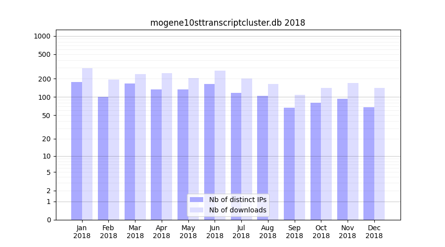mogene10sttranscriptcluster.db_2018_stats.tab| Month | Nb of distinct IPs | Nb of downloads |