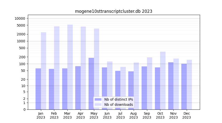 mogene10sttranscriptcluster.db_2023_stats.tab| Month | Nb of distinct IPs | Nb of downloads |