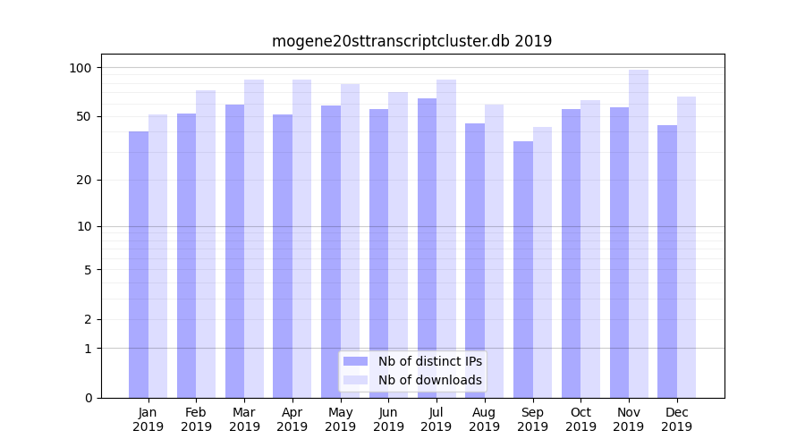mogene20sttranscriptcluster.db_2019_stats.tab| Month | Nb of distinct IPs | Nb of downloads |