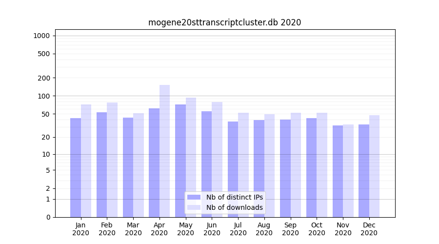 mogene20sttranscriptcluster.db_2020_stats.tab| Month | Nb of distinct IPs | Nb of downloads |