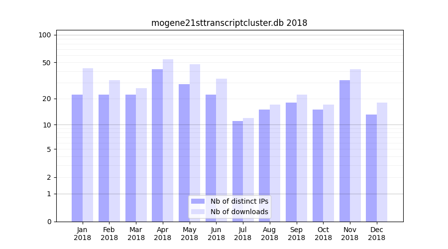 mogene21sttranscriptcluster.db_2018_stats.tab| Month | Nb of distinct IPs | Nb of downloads |