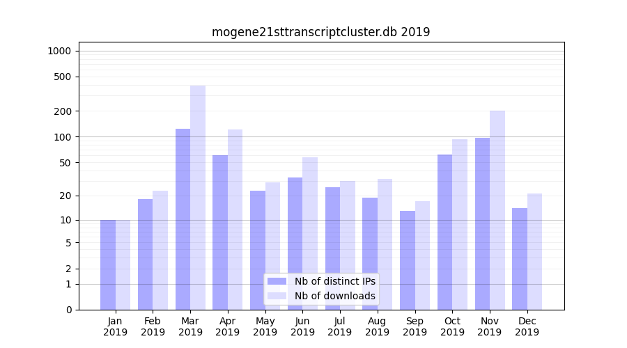 mogene21sttranscriptcluster.db_2019_stats.tab| Month | Nb of distinct IPs | Nb of downloads |