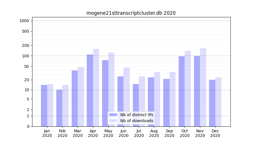 mogene21sttranscriptcluster.db_2020_stats.tab| Month | Nb of distinct IPs | Nb of downloads |