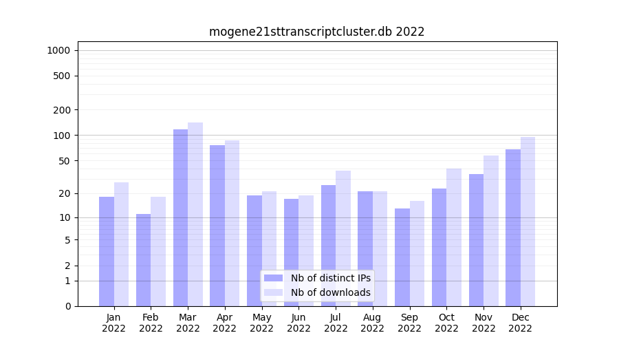 mogene21sttranscriptcluster.db_2022_stats.tab| Month | Nb of distinct IPs | Nb of downloads |