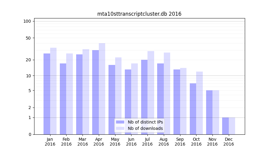 mta10sttranscriptcluster.db_2016_stats.tab| Month | Nb of distinct IPs | Nb of downloads |