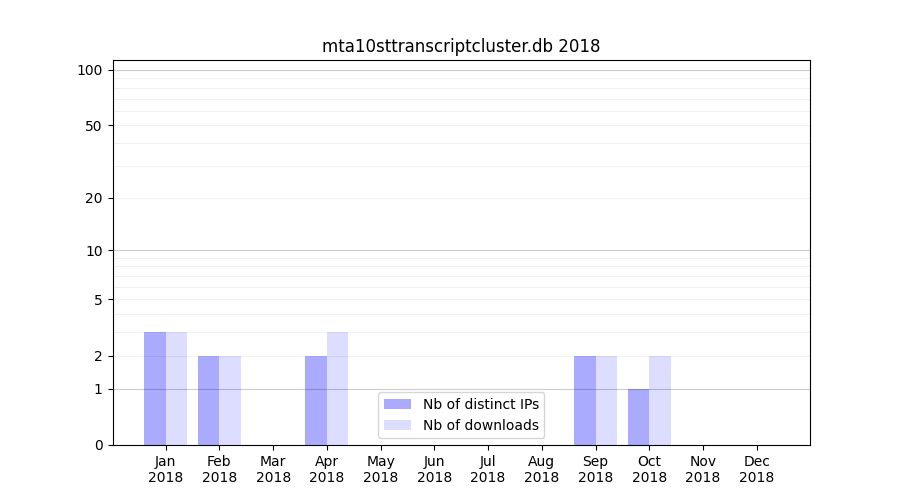 mta10sttranscriptcluster.db_2018_stats.tab| Month | Nb of distinct IPs | Nb of downloads |