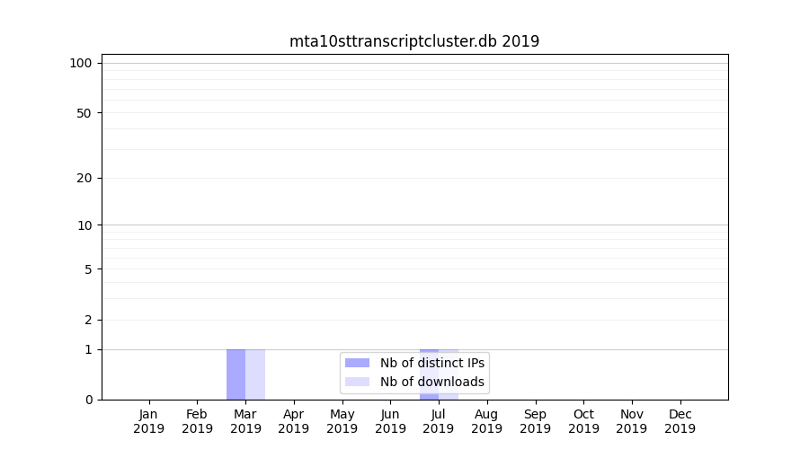 mta10sttranscriptcluster.db_2019_stats.tab| Month | Nb of distinct IPs | Nb of downloads |