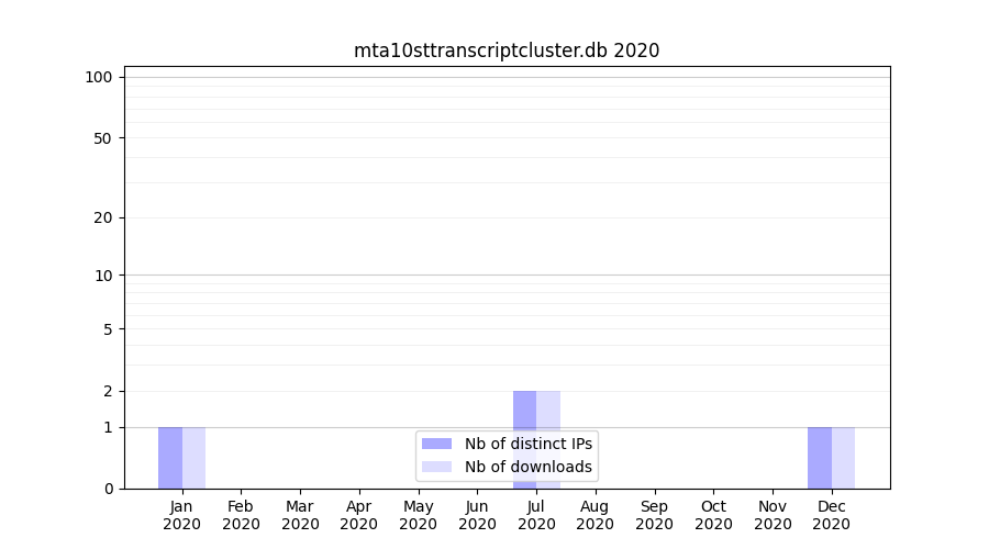 mta10sttranscriptcluster.db_2020_stats.tab| Month | Nb of distinct IPs | Nb of downloads |