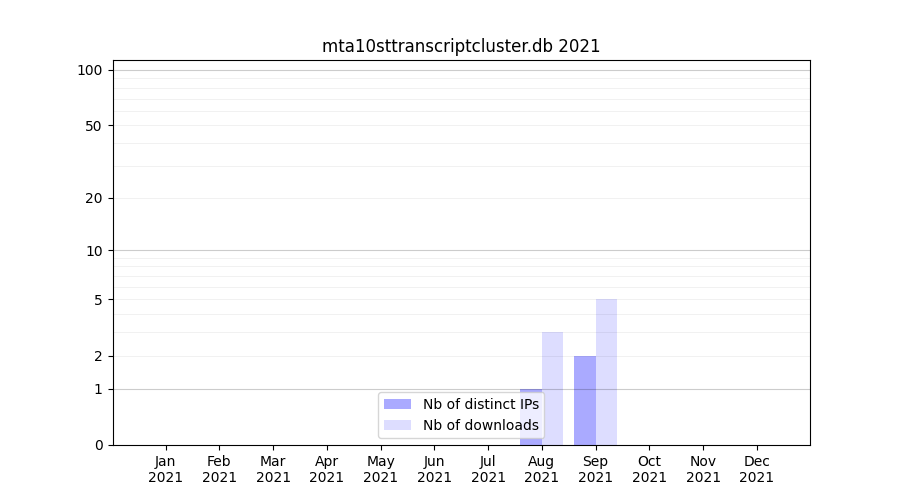 mta10sttranscriptcluster.db_2021_stats.tab| Month | Nb of distinct IPs | Nb of downloads |