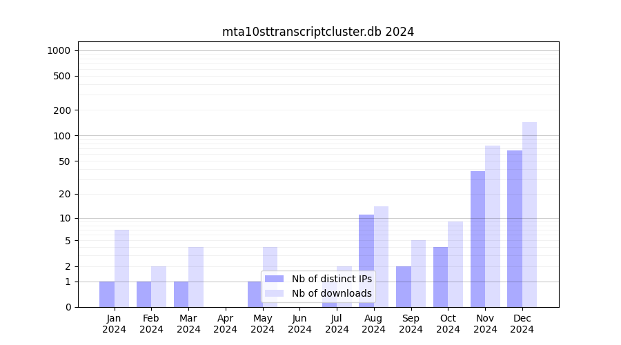 mta10sttranscriptcluster.db_2024_stats.tab| Month | Nb of distinct IPs | Nb of downloads |