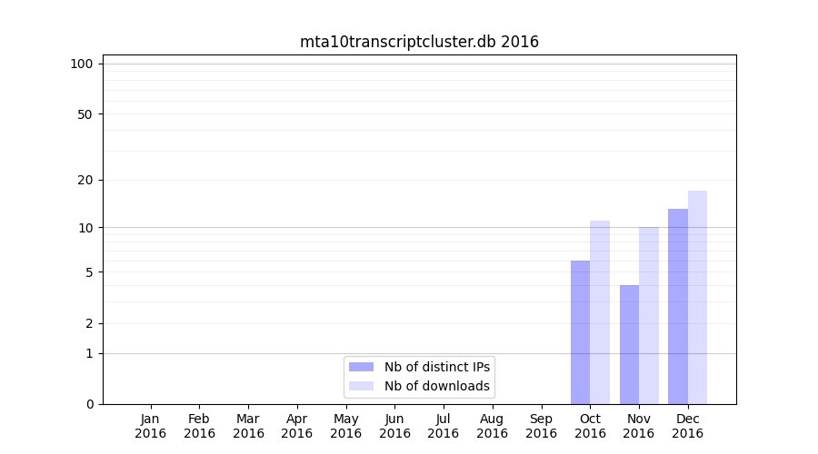 mta10transcriptcluster.db_2016_stats.tab| Month | Nb of distinct IPs | Nb of downloads |