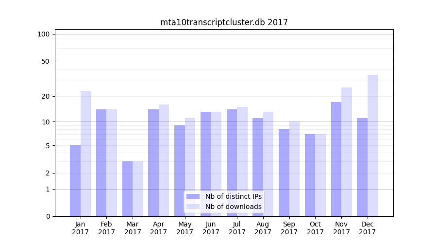 mta10transcriptcluster.db_2017_stats.tab| Month | Nb of distinct IPs | Nb of downloads |