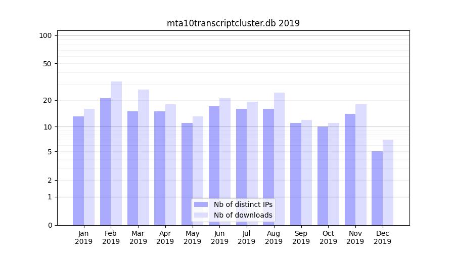 mta10transcriptcluster.db_2019_stats.tab| Month | Nb of distinct IPs | Nb of downloads |